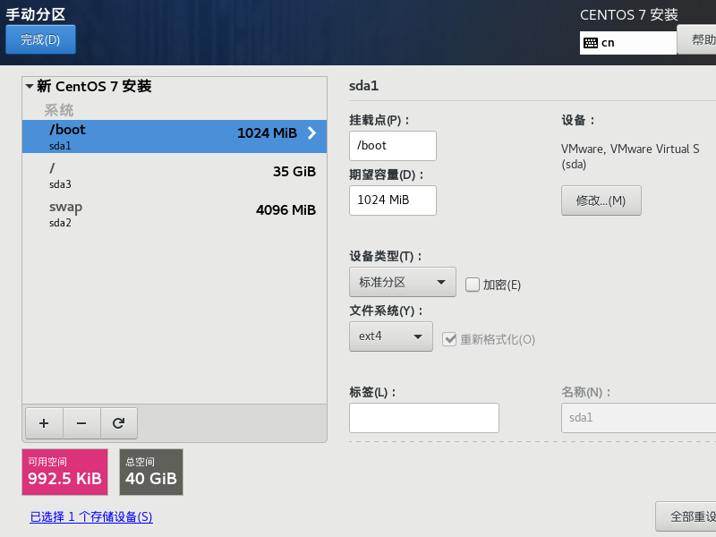 /boot 引导分区分配 1G 空间,文件系统为 ext4