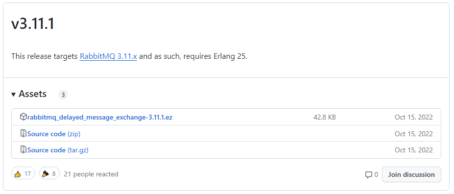 比如RabbitMQ版本为3.11.1,选择下载rabbitmq_delayed_message_exchange-3.11.1.ez