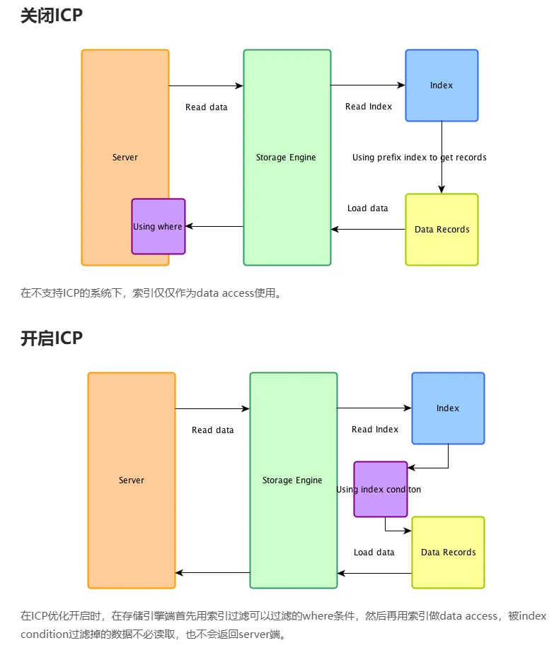 在MariaDB 5.3.3(MySQL是在5.6)开始引入的一种叫做Index Condition Pushdown(索引下推,以下简称ICP)的查询优化方式,正常是默认开启的。
