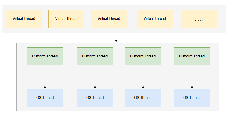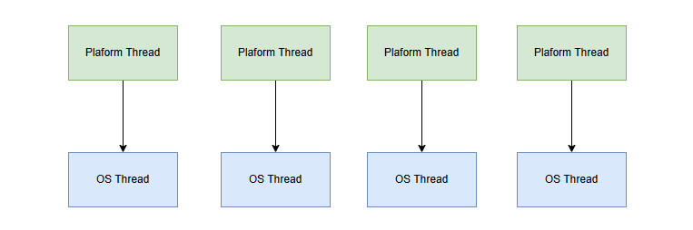 在传统线程池中,在 ThreadPoolExecutor 中定义的线程,会创建一堆 Platform Thread(平台线程),它对操作系统 OS Thread的对应关系是1对1的绑定关系,也就是说线程池中的每一个线程都是真实的占用了操作系统的线程。